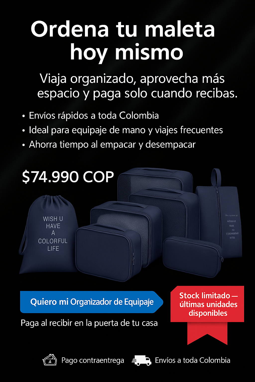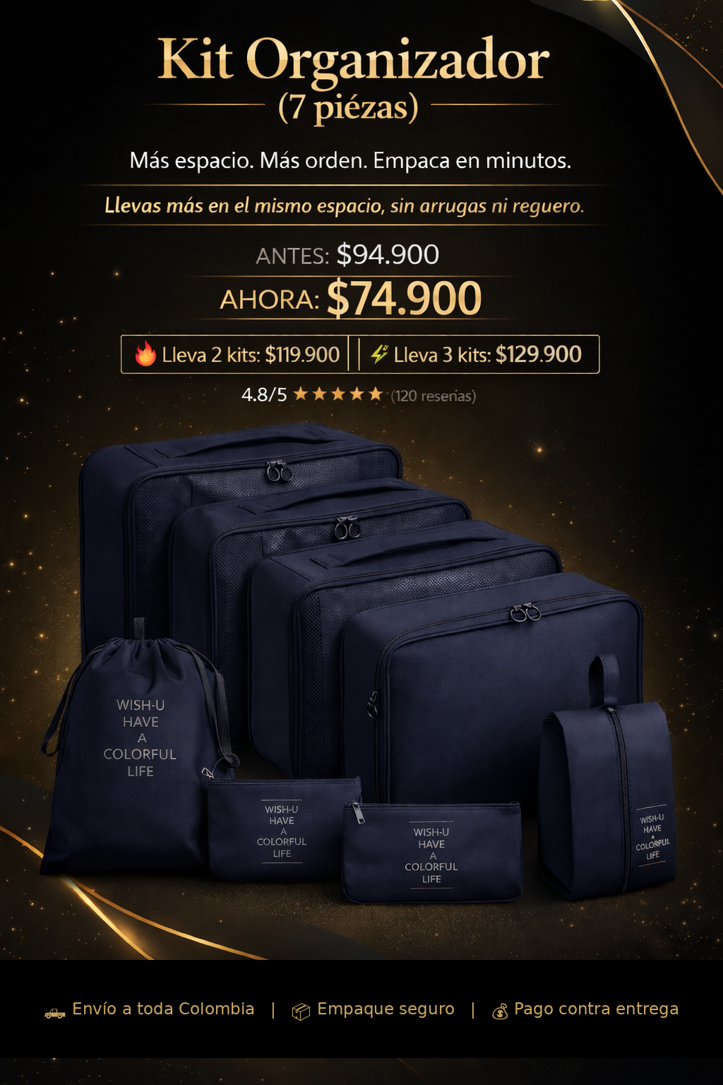 ✈️ Kit organizador 7 piezas — viaja sin estrés y sin desorden 💼 1 kit por $74.900 (antes $94.900) — ahorra 20% hoy 🔥 2 kits por $119.900 — ahorra 35% y organiza en pareja ⭐ 3 kits por $129.900 — 55% OFF, la opción más inteligente 🎁 Ideal para viajes, familia o regalo — oferta por tiempo limitado
